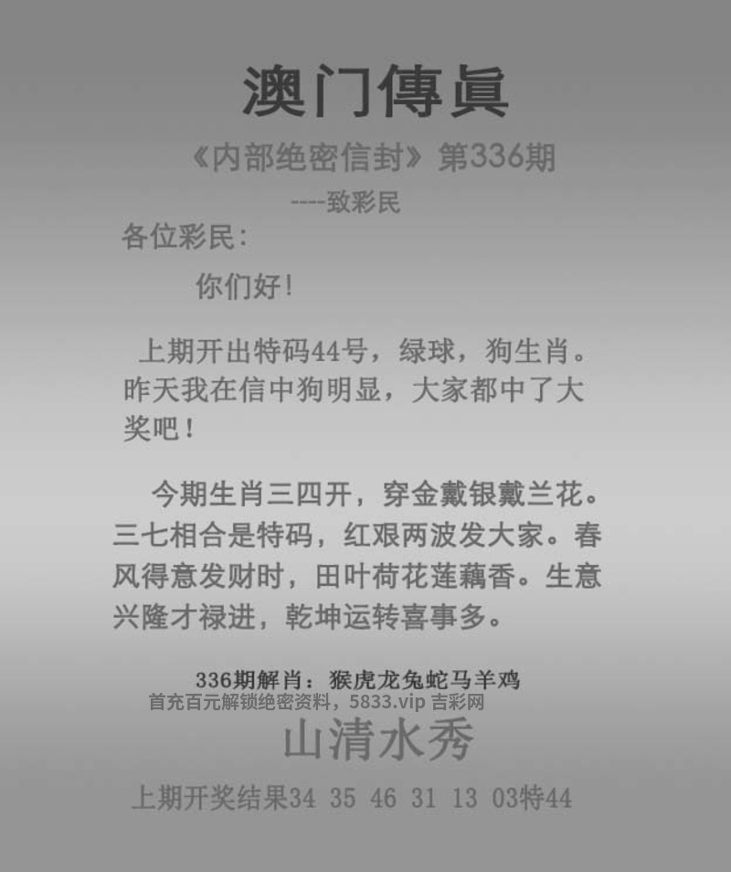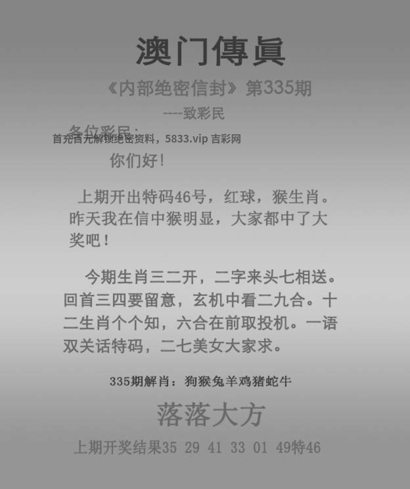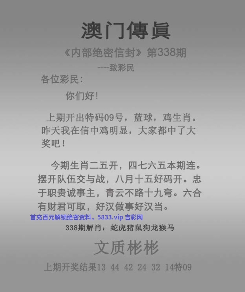 338期【马会传真】开狗08准 今期生肖二五开,四七六五本期连 摆开队伍交与战,八月十五好码开 忠于职贵诚事主,青云不路十九弯 六合有财君可取,好汉做事好汉当 解:今期生肖二五开,解大数特码25-49,忠于职贵诚事主,解家禽生肖牛猪鸡羊狗马 综合:羊虎狗蛇龙猪马兔牛 主特:11.04.08.01.26.07.24.15.05 |